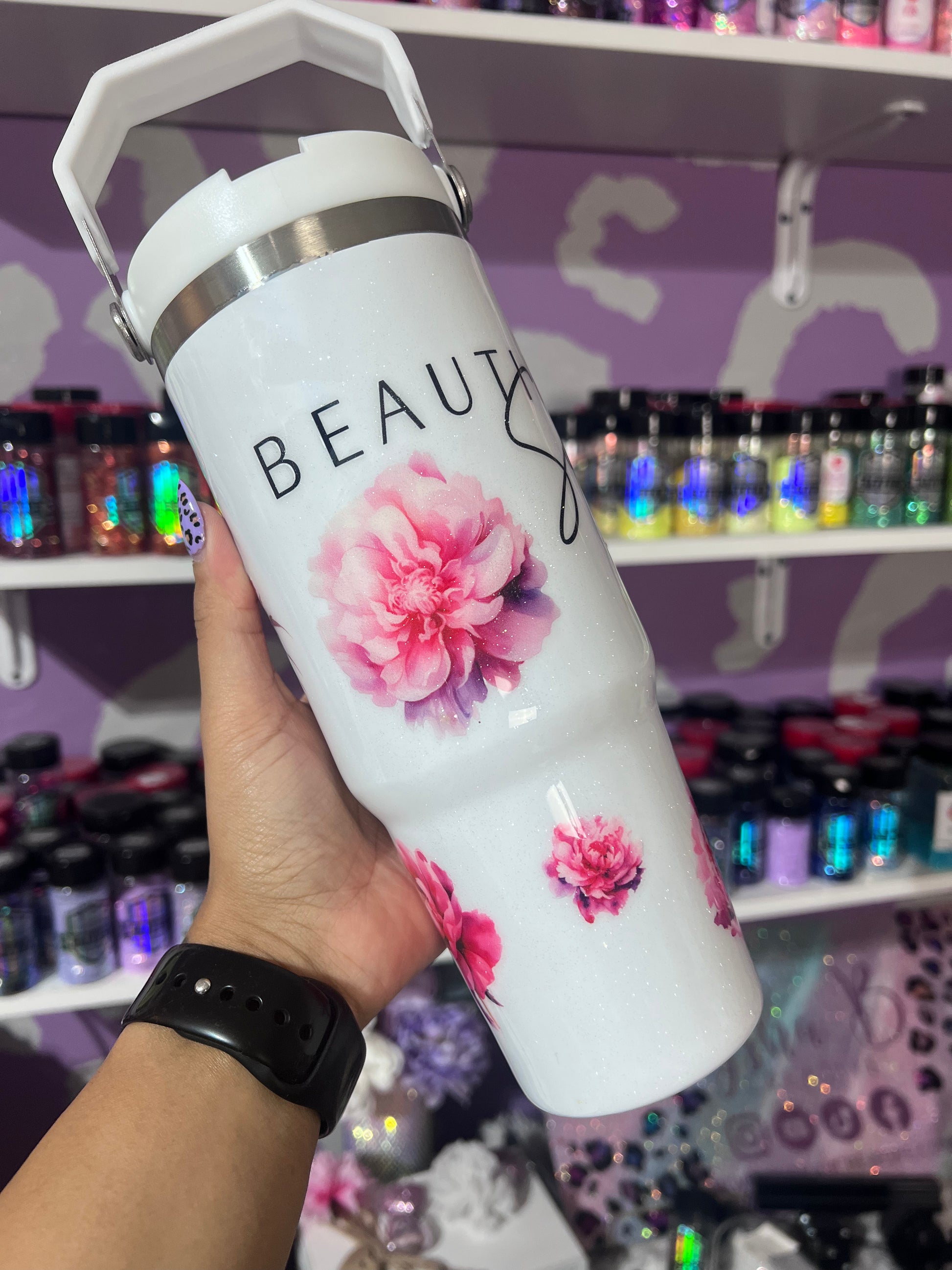 Nothing says sippin pretty than this gorgeous handmade tumbler. Hand-crafted with inks, glitter and epoxy, this tumbler is as unique as you are. Stay hydrated and motivated on the go.