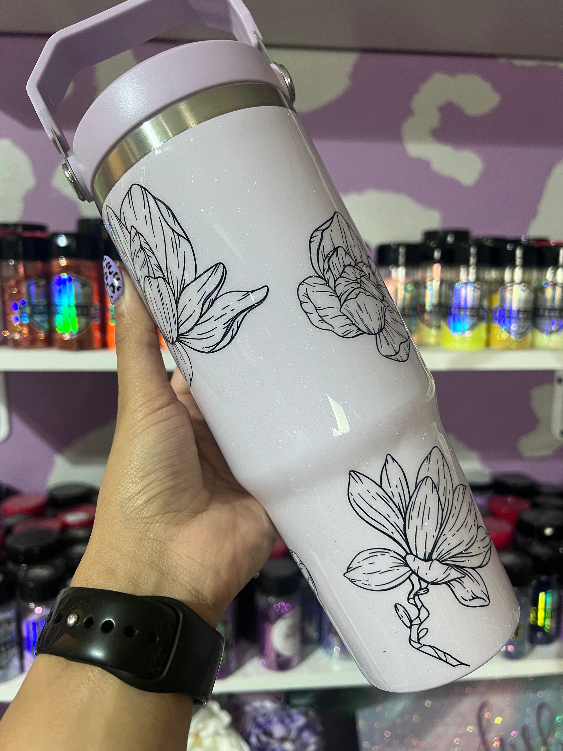 Nothing says sippin pretty than this gorgeous handmade tumbler. Hand-crafted with inks, glitter and epoxy, this tumbler is as unique as you are. Stay hydrated and motivated on the go.